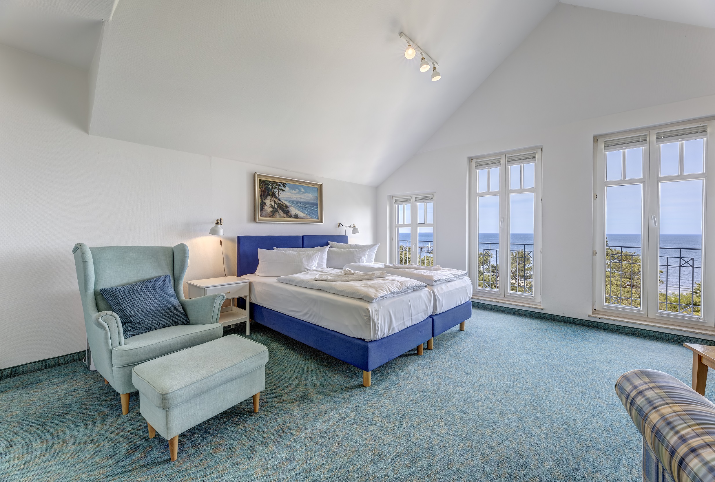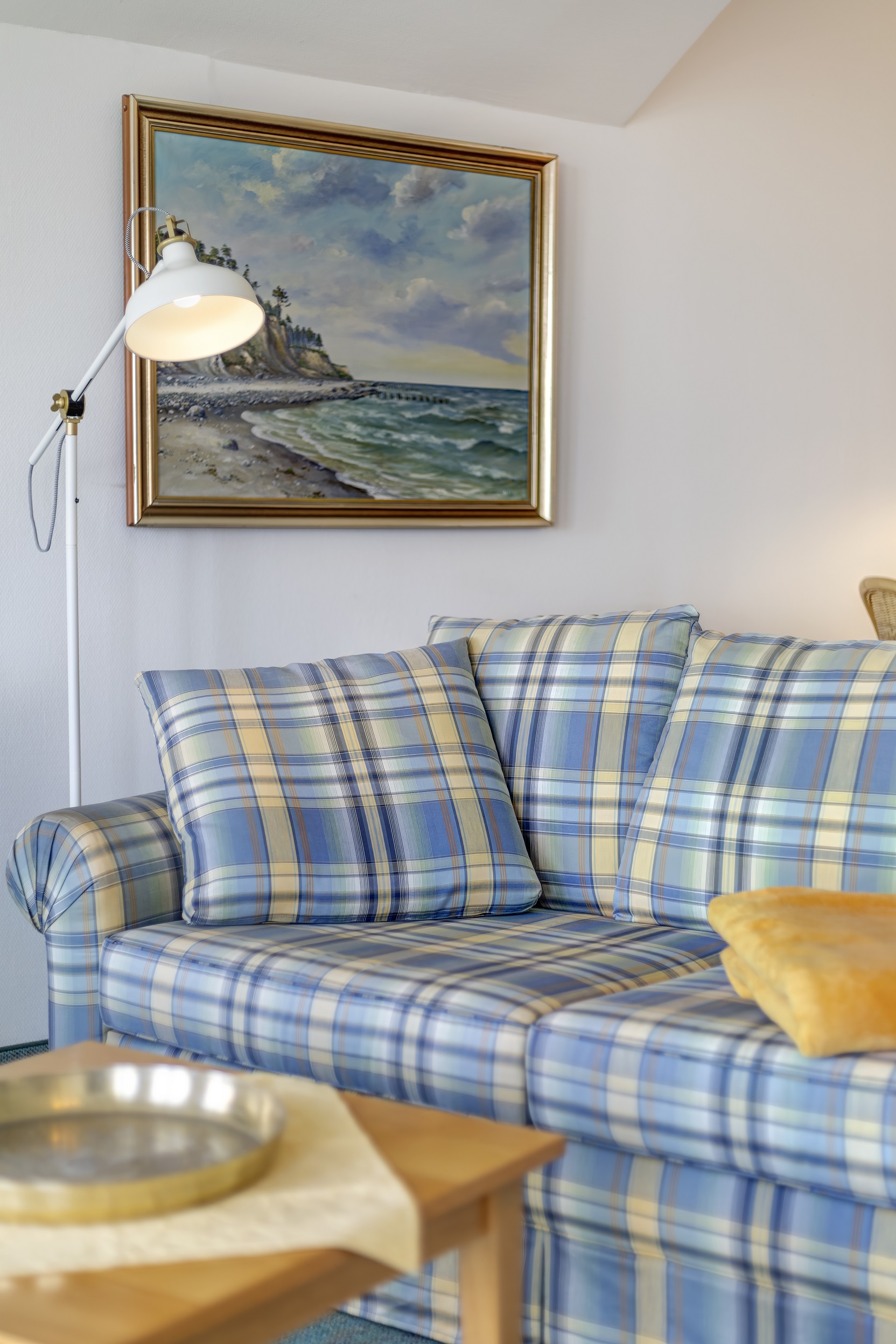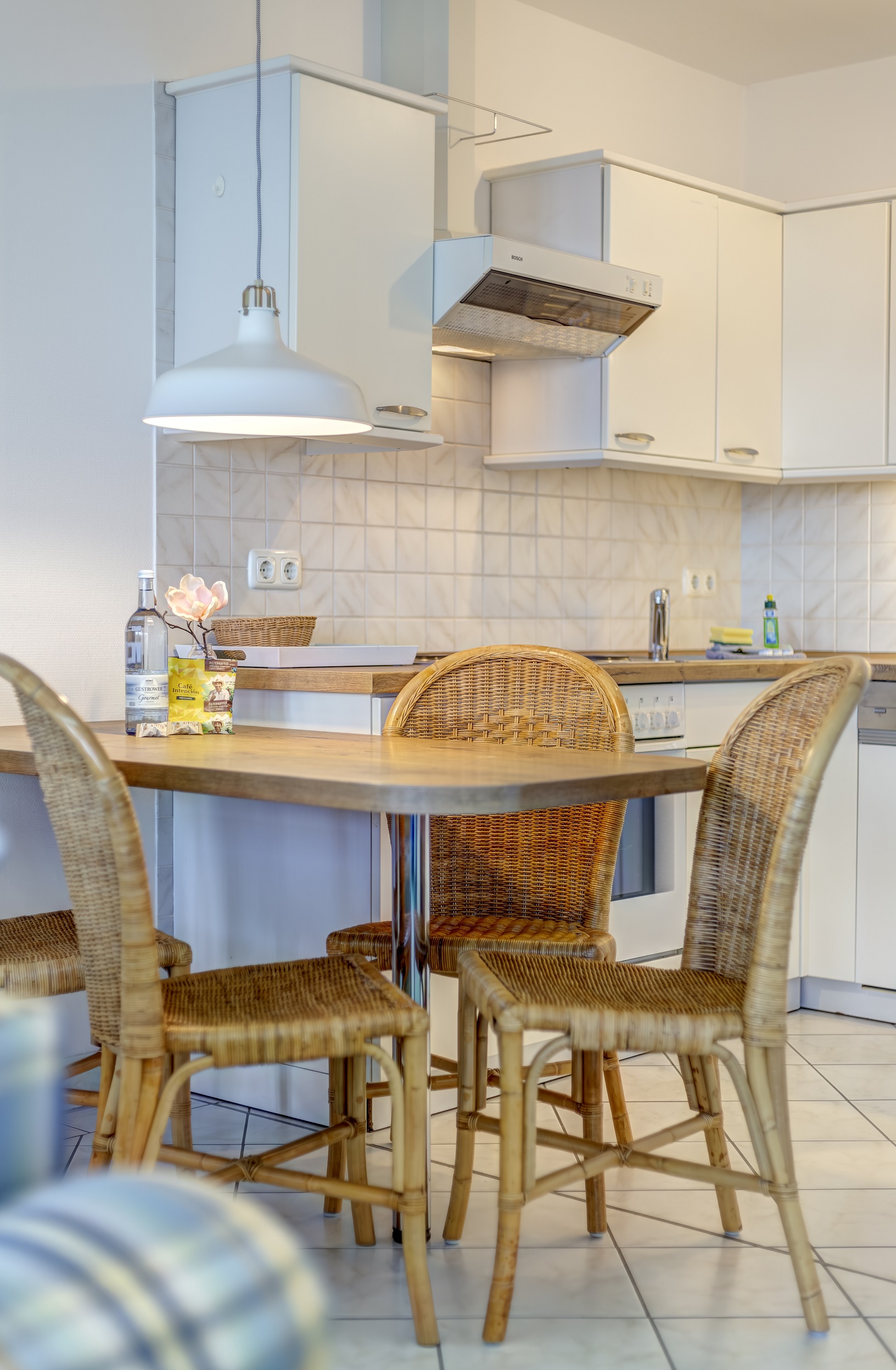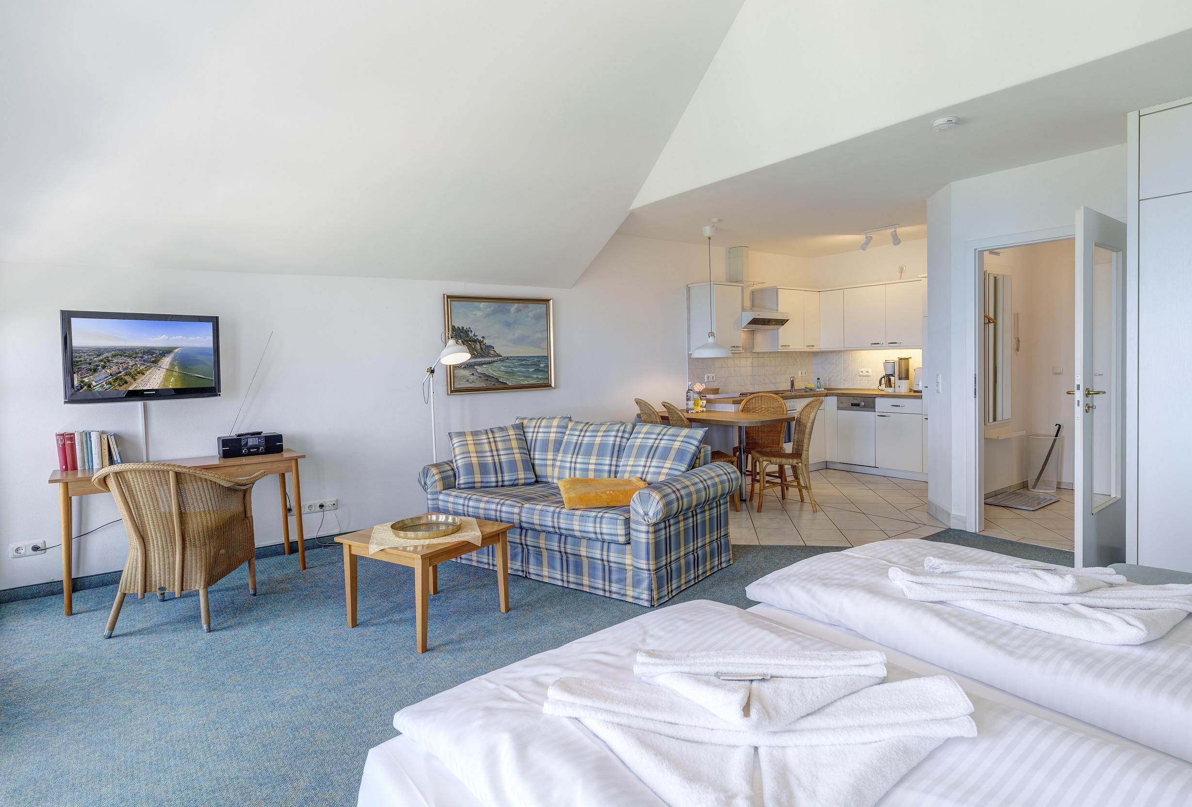 Die Küche ist offen und ein kleiner Esstisch grenzt den Küchenbereich zum Wohnraum ab. So kann man auch zum Frühstück den Blick auf die Ostsee genießen. Das etwas kleinere Bad enthält eine Dusche. Die Gesamtgröße der 1-Raum-Wohnung beträgt etwa 35 m².