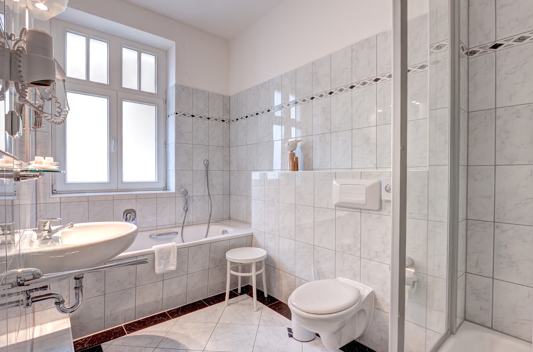 - WC, Dusche, teilweise plus Wanne, Haartrockner, Duschbad/Shampoo